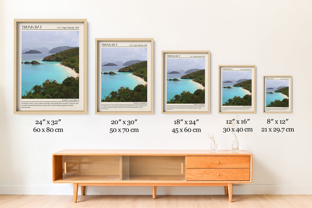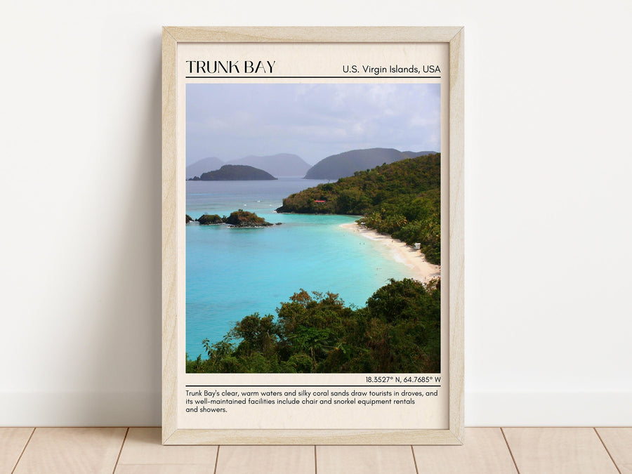 Trunk Bay in the U.S. Virgin Islands is a paradise for travelers seeking adventure, relaxation, and inspiration. Whether you're snorkeling in its vibrant waters, relaxing on its pristine beaches, hiking its scenic trails, capturing its beauty through art, or exploring its rich history, Trunk Bay offers something for everyone. To bring a piece of this tropical haven home with you, consider adding a Trunk Bay travel poster print or city art print to your collection. These stunning pieces of Trunk Bay wall art will remind you of your unforgettable adventure.