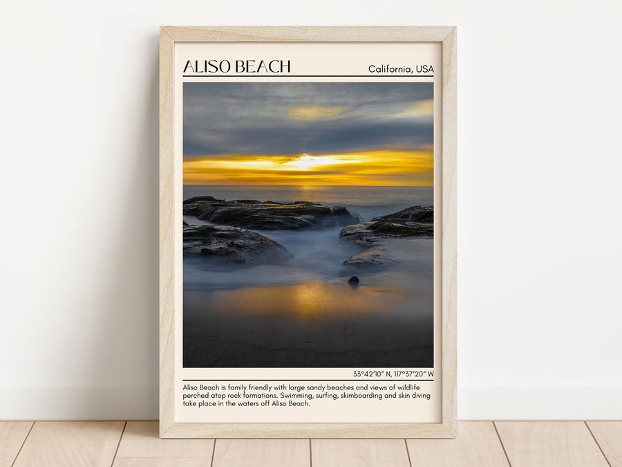 Aliso Beach, California, offers endless opportunities for outdoor adventure, relaxation, and coastal exploration. Whether you're surfing the waves, exploring tide pools, or capturing the sunset with your camera, let Joyie be your companion on this unforgettable journey. Explore our collection of travel posters and city art prints, and bring home the magic of Aliso Beach to adorn your walls and inspire your next beachfront getaway.