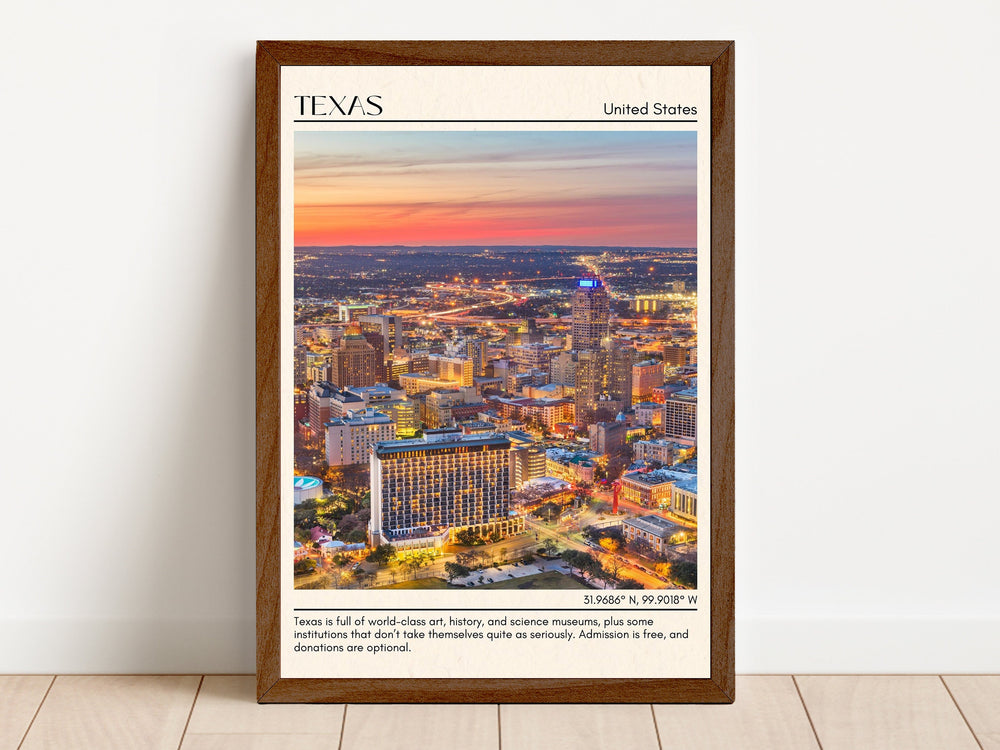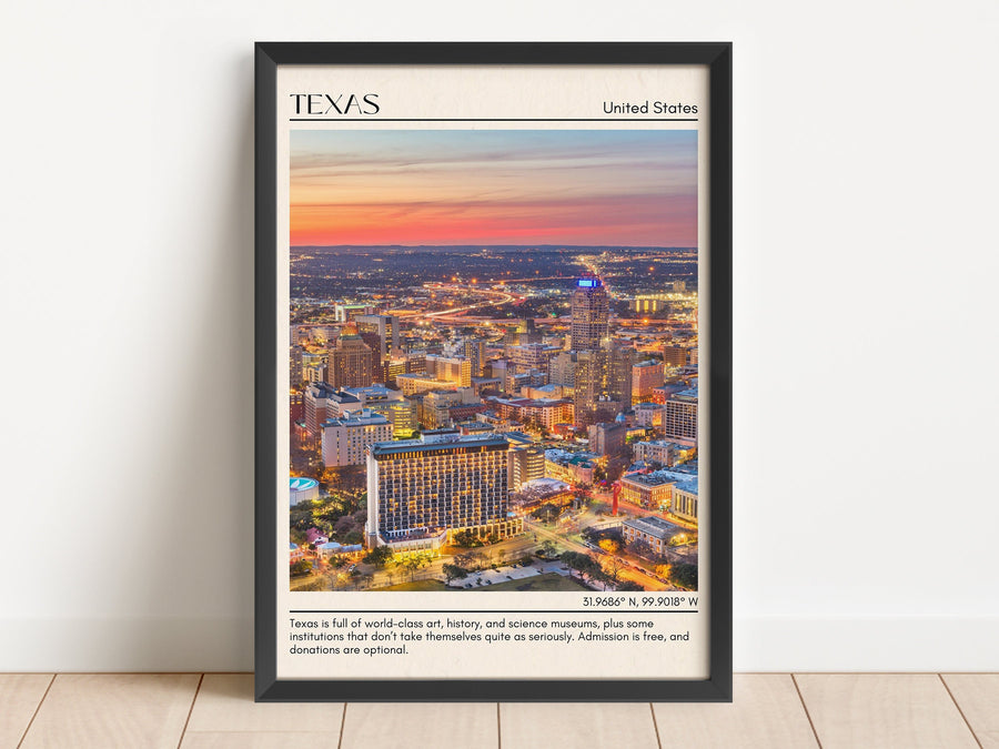 Embrace the Urban Energy of Austin: Known as the "Live Music Capital of the World," Austin is a thriving city that pulsates with creativity and innovation. Explore the lively entertainment district on Sixth Street, catch a live music performance at one of the numerous venues, or visit the iconic Texas State Capitol building. Immerse yourself in the city's vibrant food scene, boasting a fusion of flavors from around the world. Our Texas prints and posters will infuse your space with the energy and spirit of Austin.