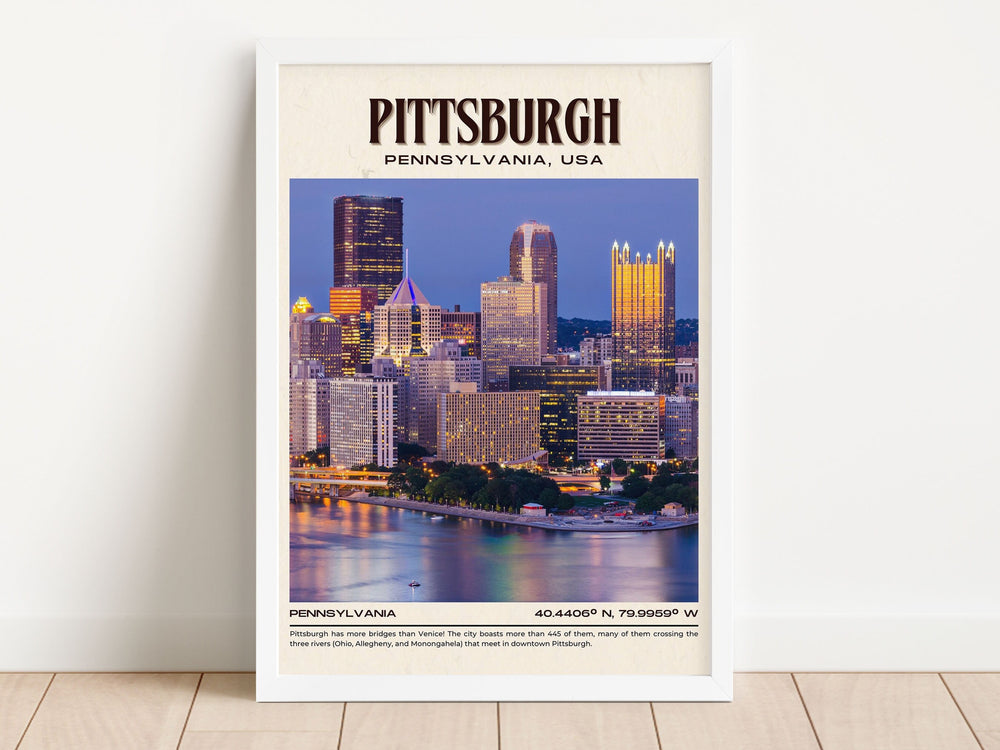 Pittsburgh, Pennsylvania, is a city that captivates visitors with its rich history, vibrant culture, and breathtaking views. Whether you're exploring its museums, enjoying the tranquility of its botanical gardens, or immersing yourself in its bustling neighborhoods, Pittsburgh offers a diverse range of experiences. Capture the essence of this remarkable city with our travel poster prints, city art prints, and vibrant city color palettes. Let our Pittsburgh posters and prints adorn your walls, reminding you of the beauty and memories made in this remarkable city. Start your Pittsburgh adventure today!