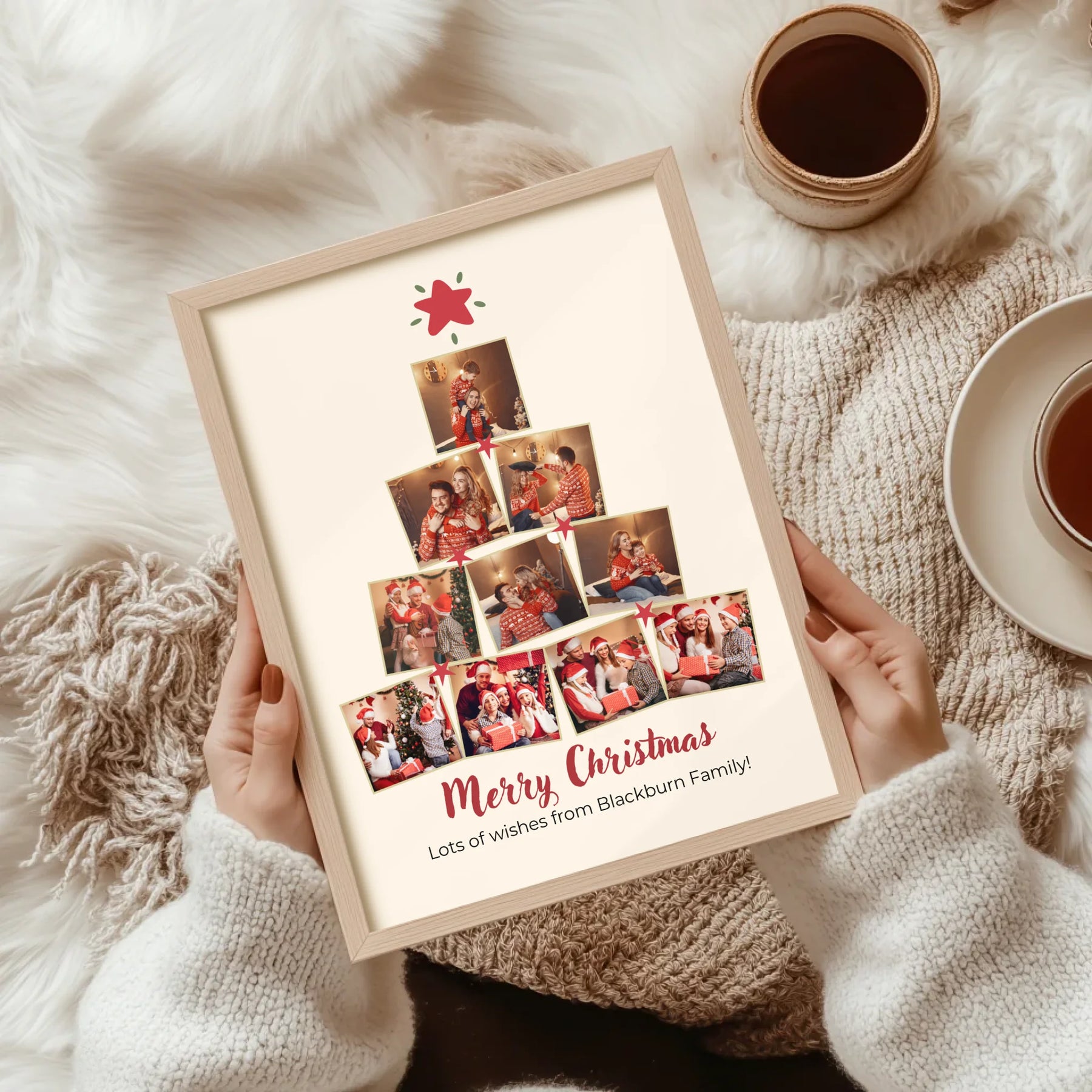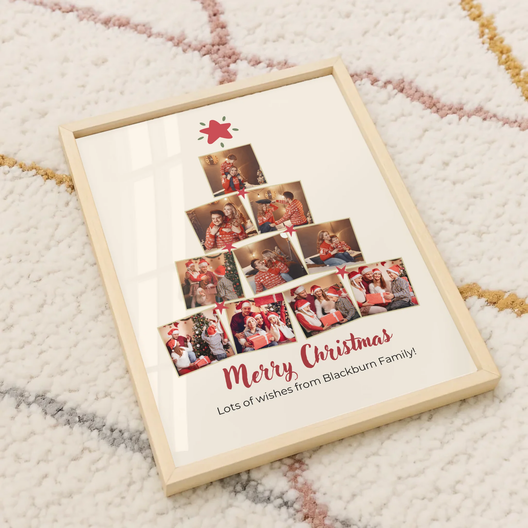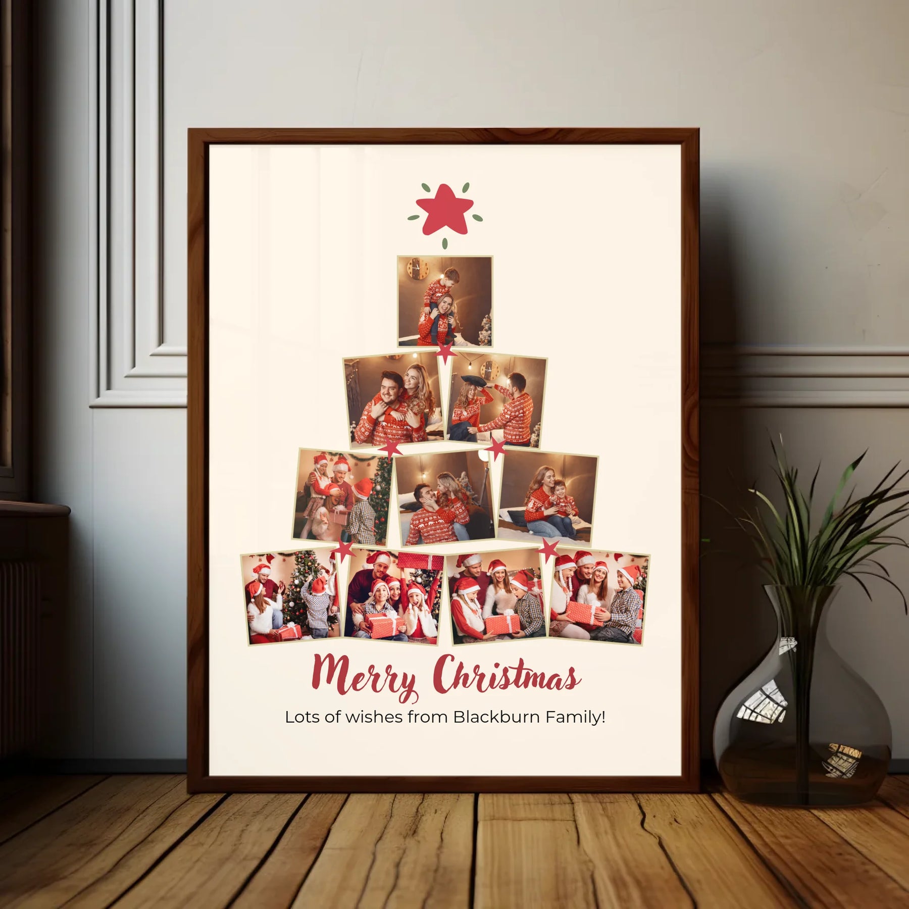 Make this season unforgettable with our Christmas Tree Photo Collage - a festive and personalized print that turns your favorite photos into a beautifully arranged tree-shaped design. Featuring your selected images and a custom message, this unique holiday keepsake brings warmth, love, and cheer to any space.
