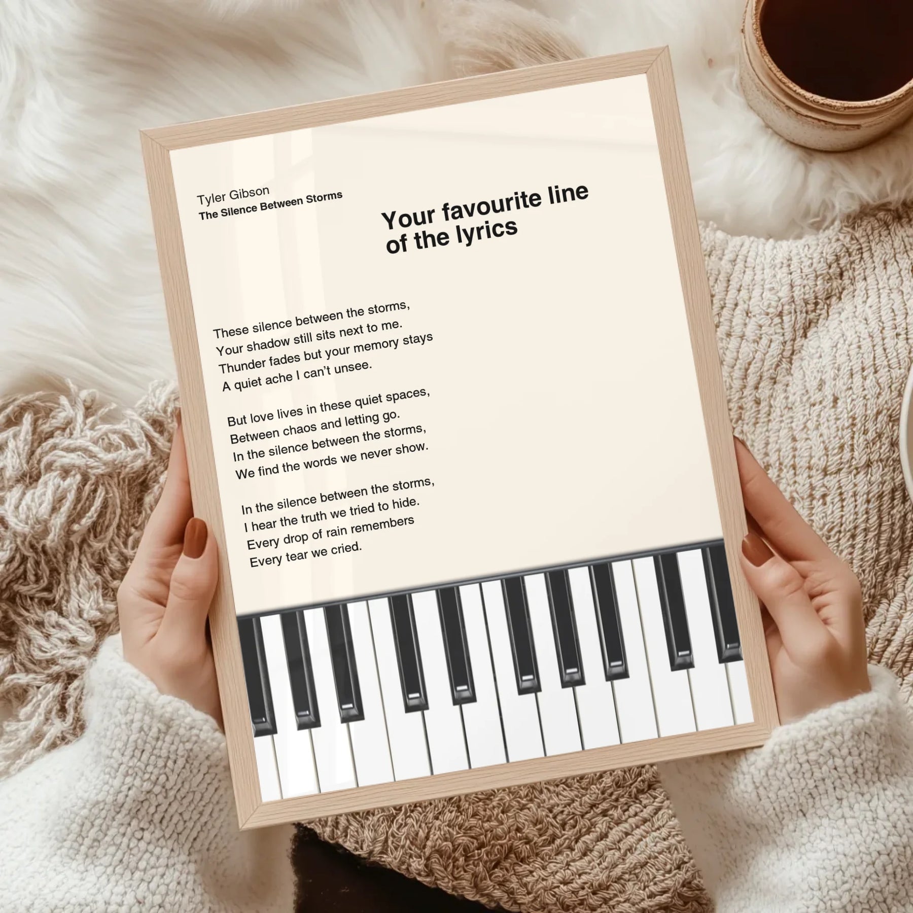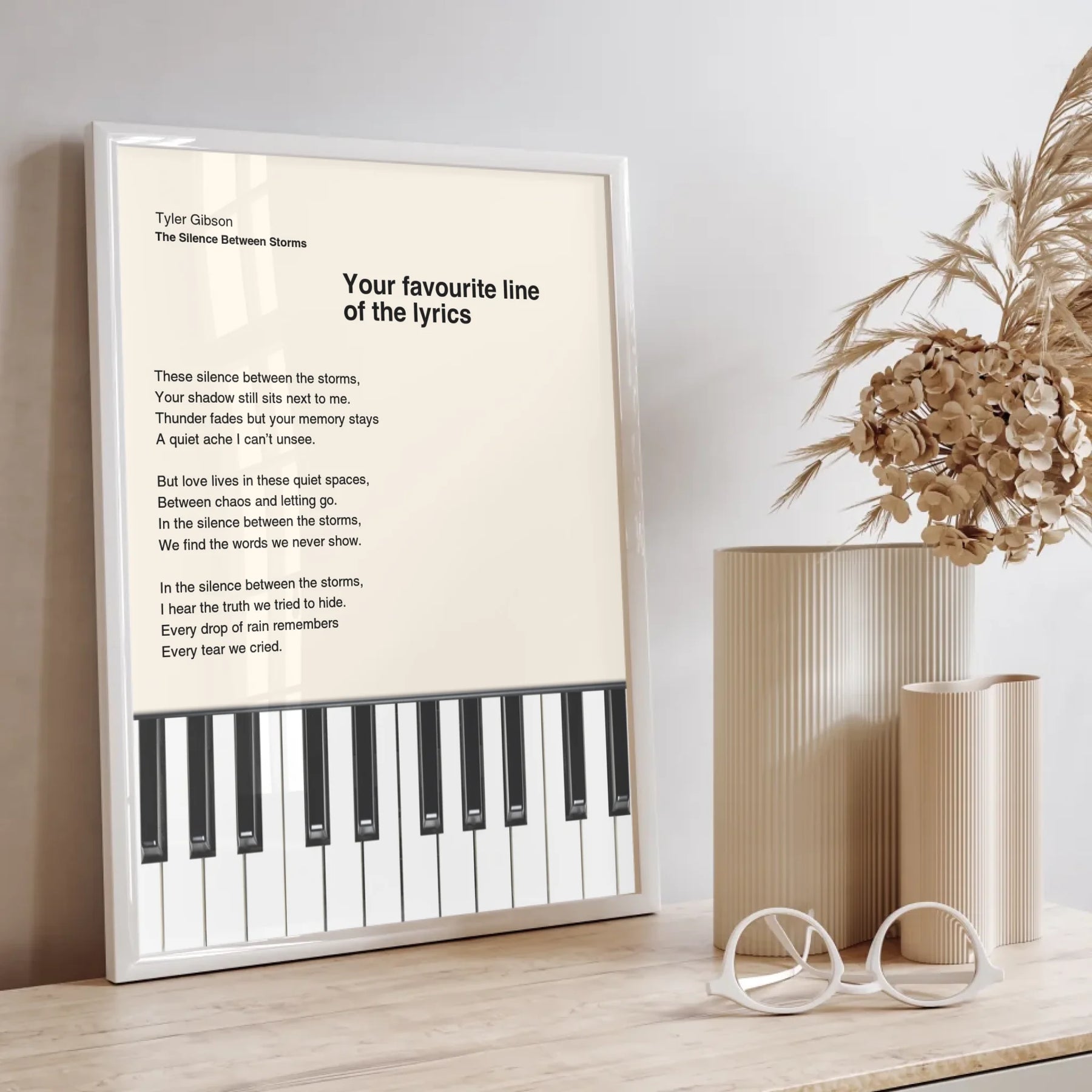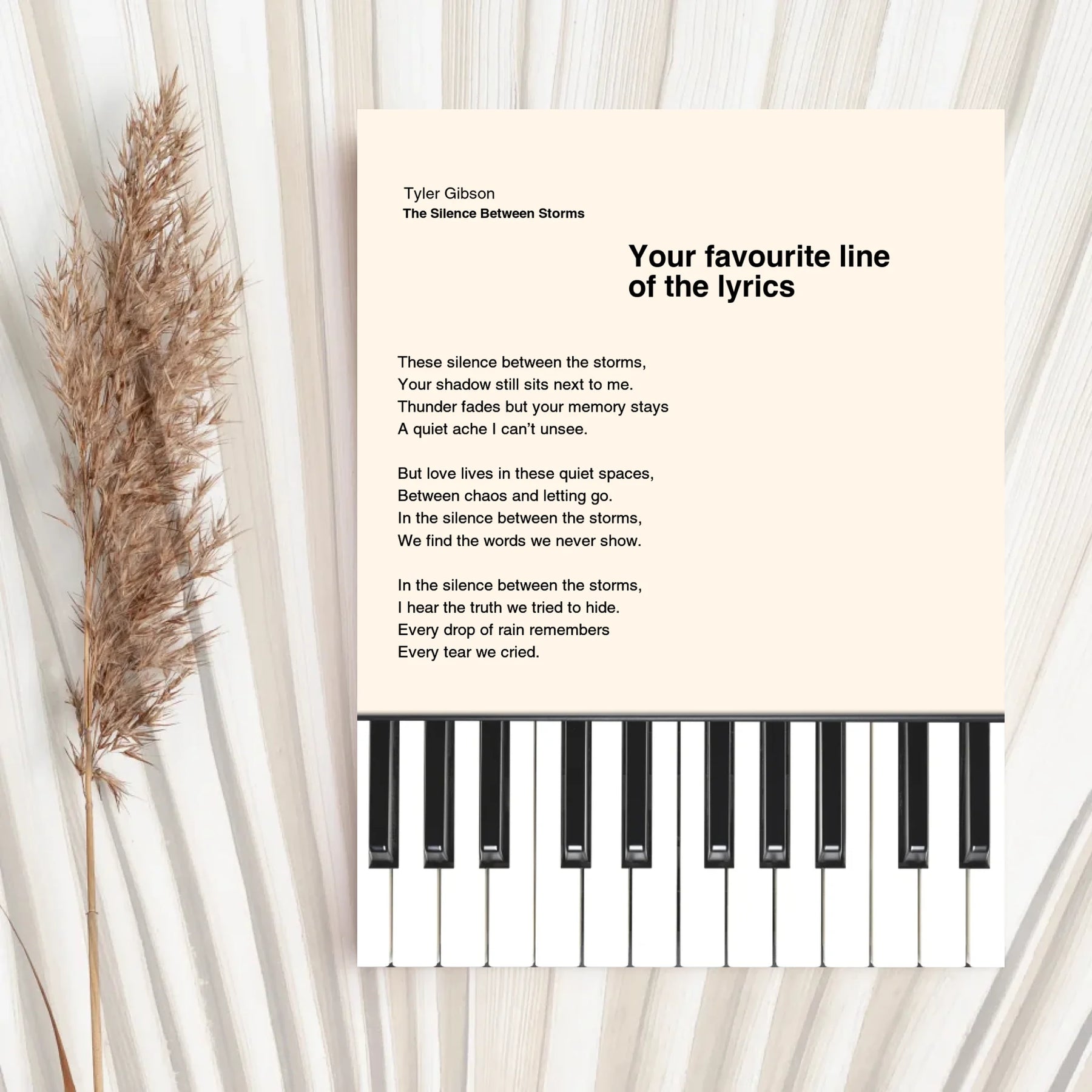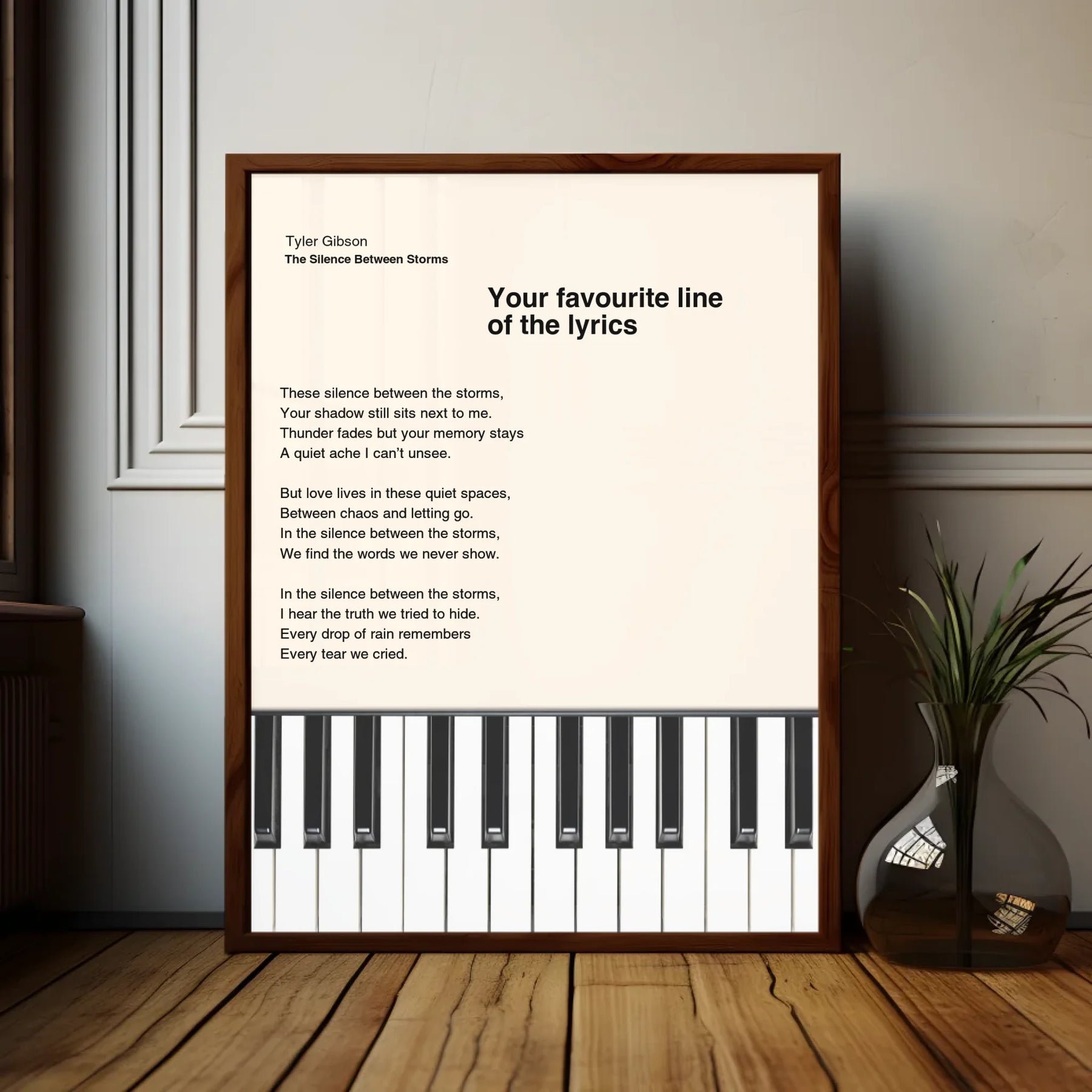 Celebrate the soundtrack of your life with our Custom Piano Lyrics Art. This personalized music poster lets you feature meaningful lyrics alongside elegant piano-inspired design elements, creating a timeless piece of wall art perfect for any music lover or couple.