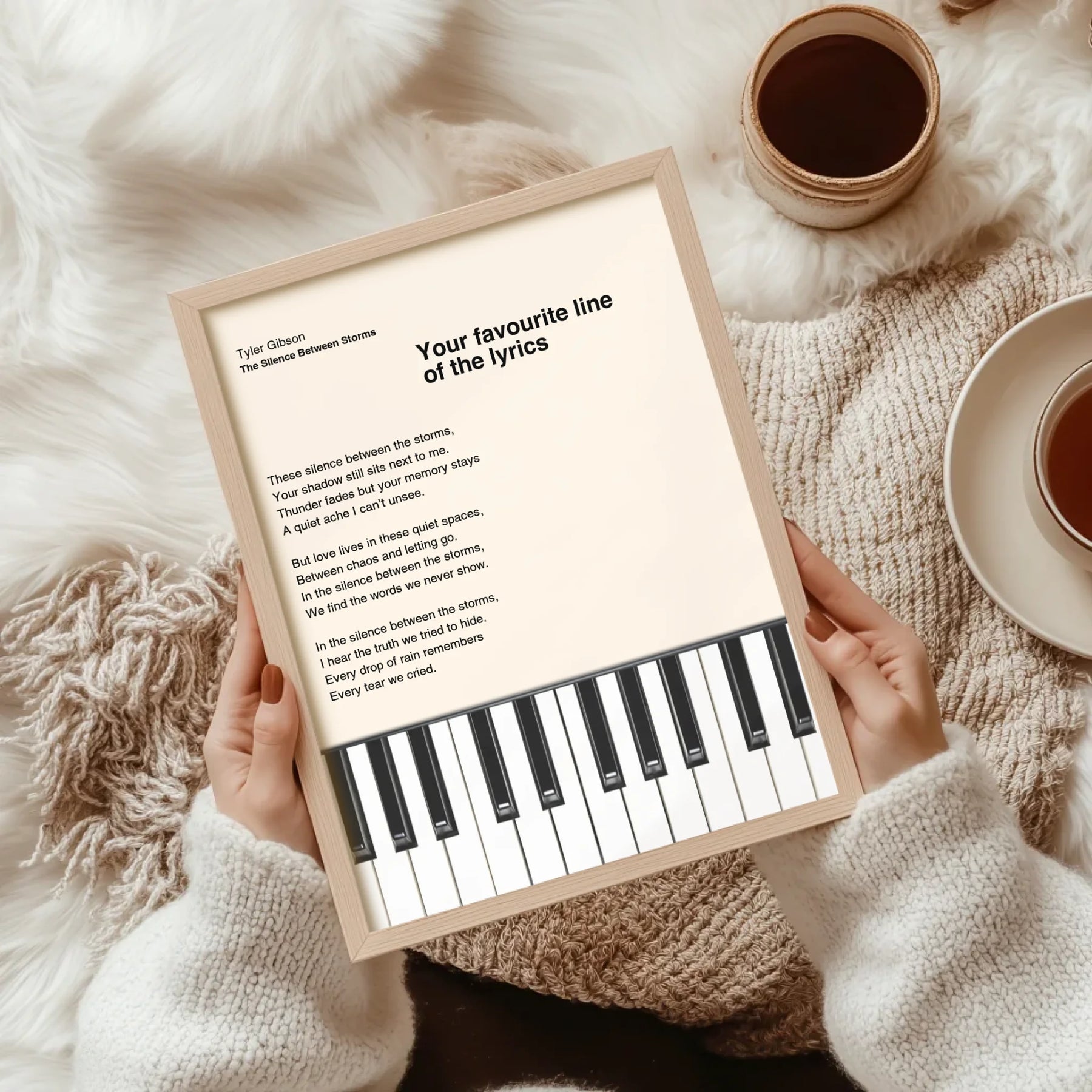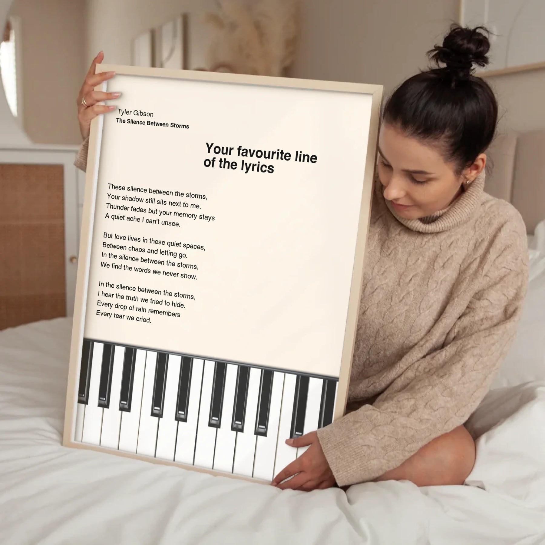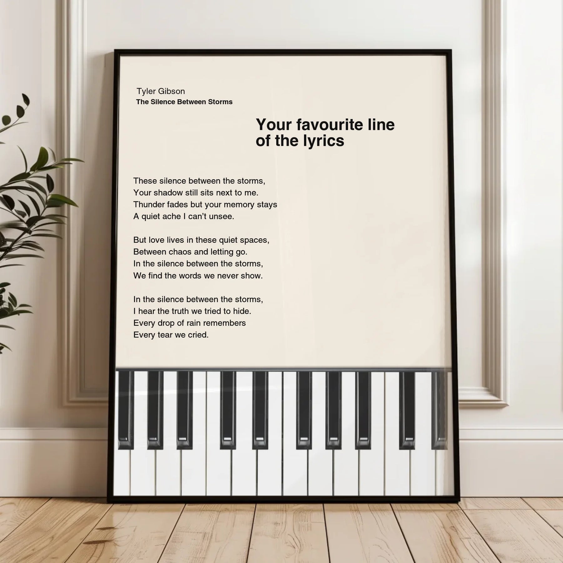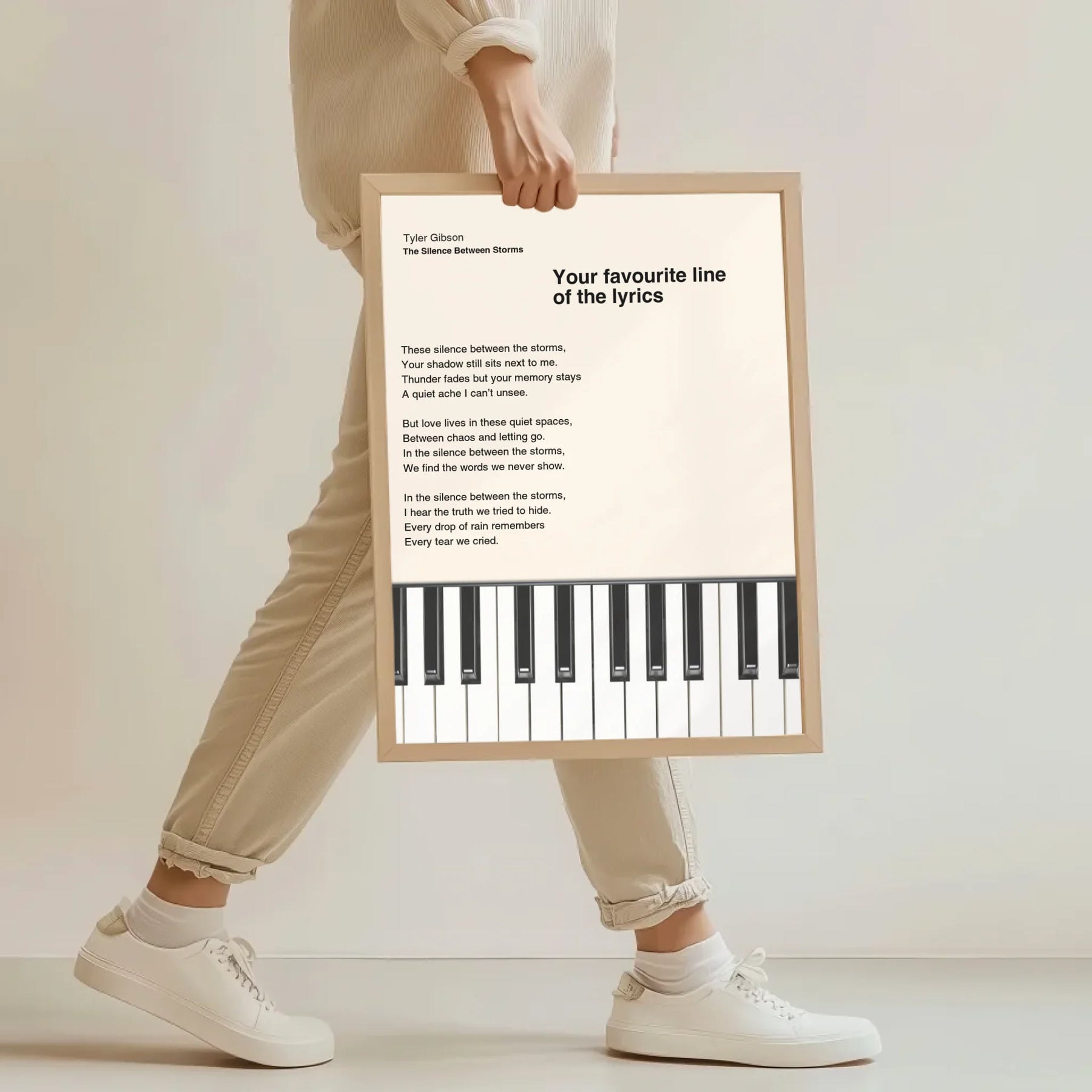 Celebrate the soundtrack of your life with our Custom Piano Lyrics Art. This personalized music poster lets you feature meaningful lyrics alongside elegant piano-inspired design elements, creating a timeless piece of wall art perfect for any music lover or couple.