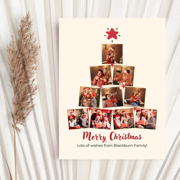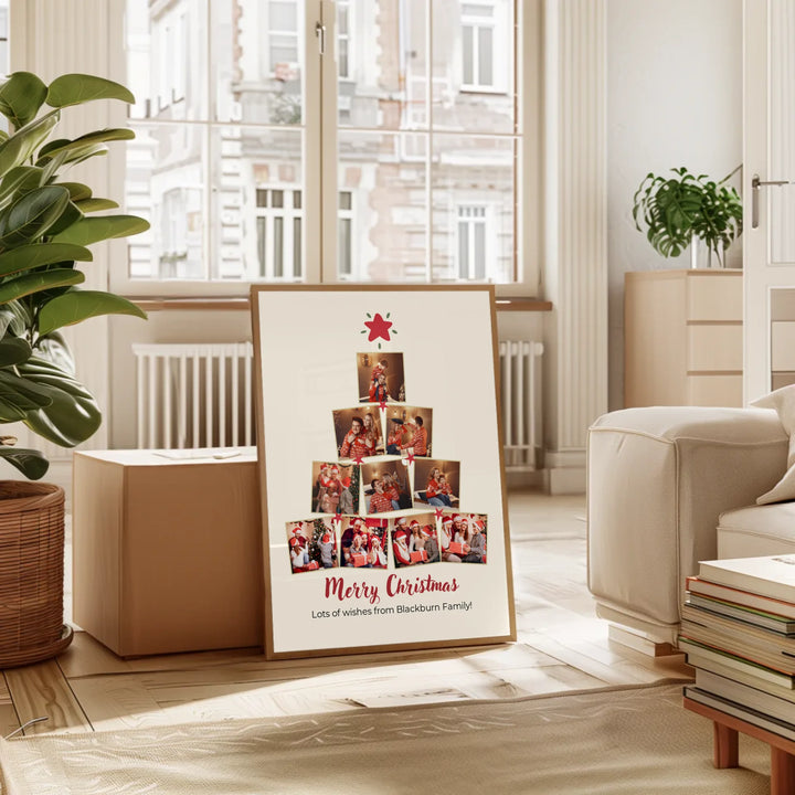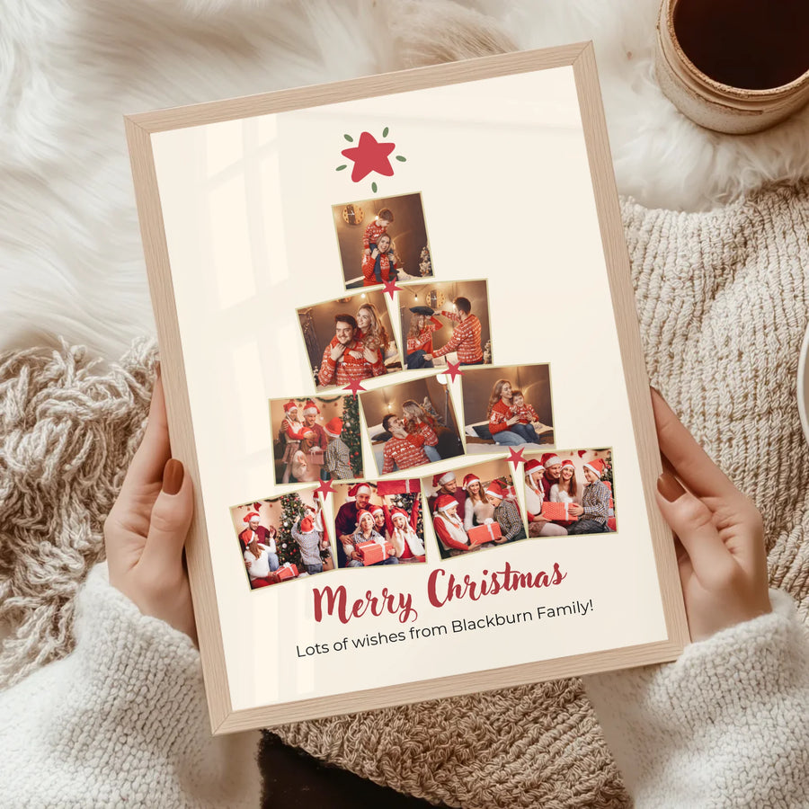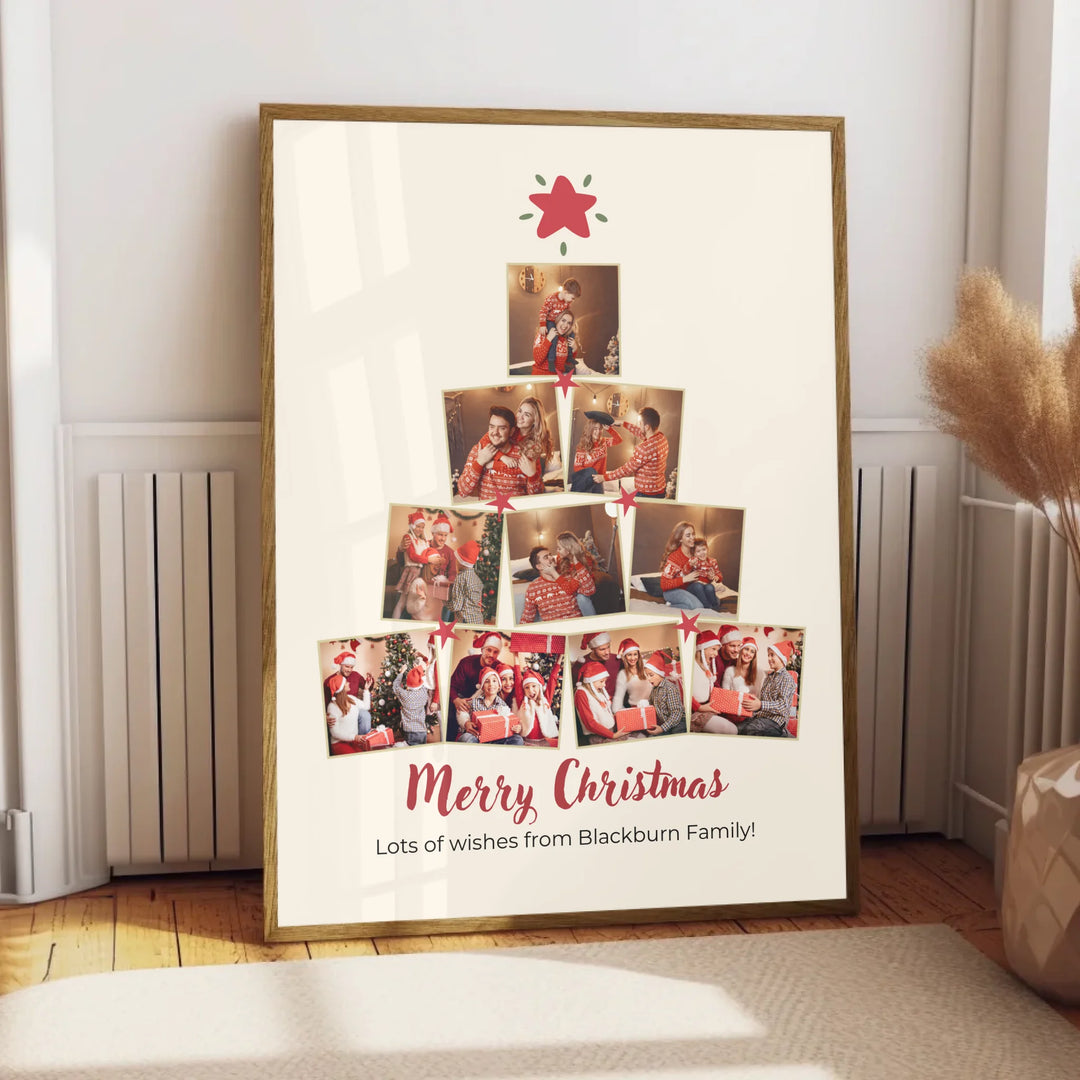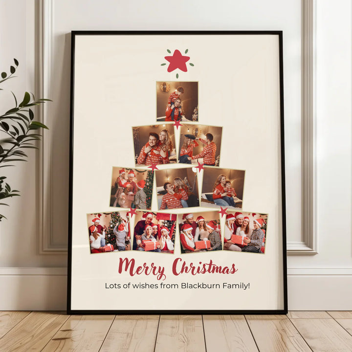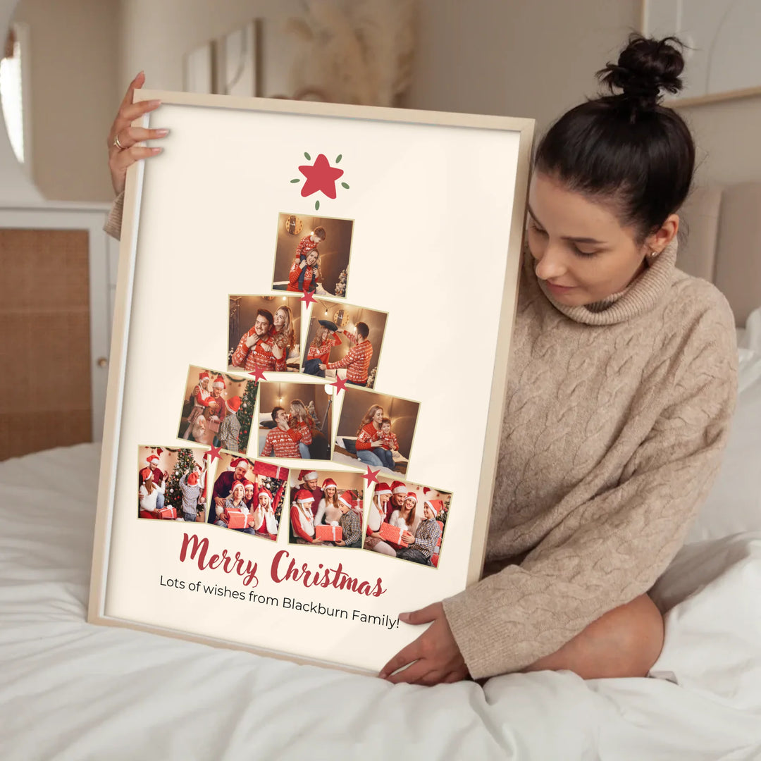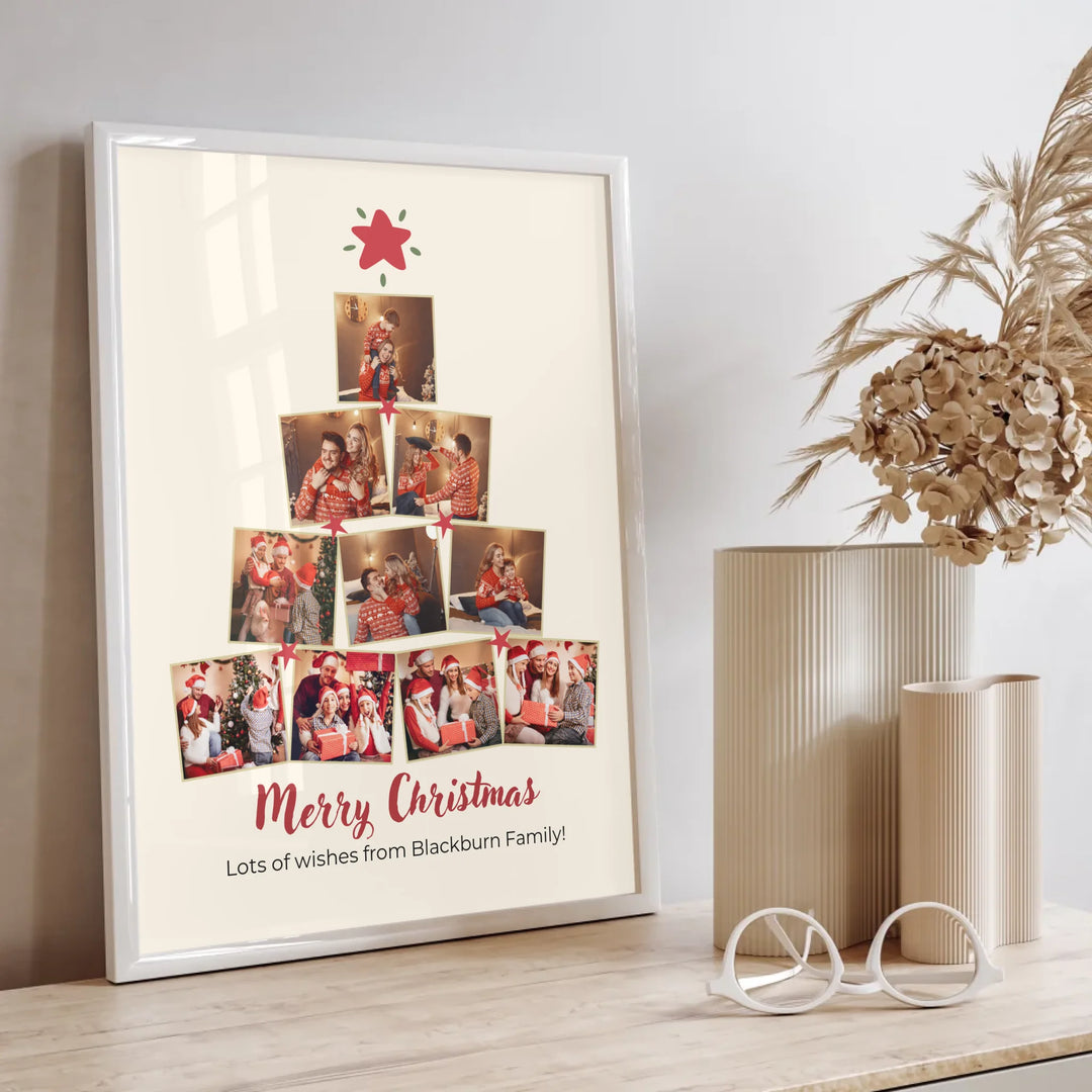 Make this season unforgettable with our Christmas Tree Photo Collage - a festive and personalized print that turns your favorite photos into a beautifully arranged tree-shaped design. Featuring your selected images and a custom message, this unique holiday keepsake brings warmth, love, and cheer to any space.