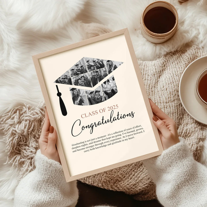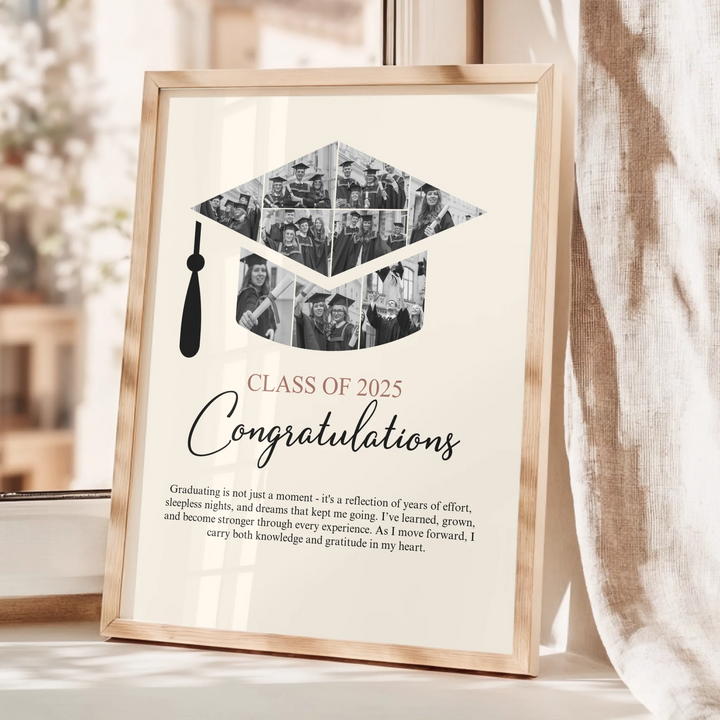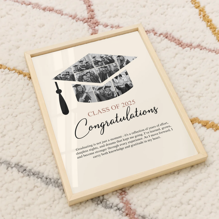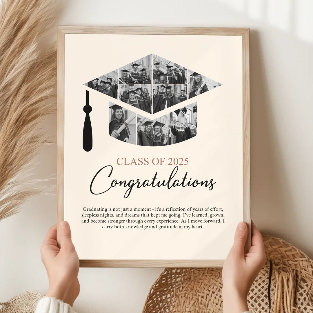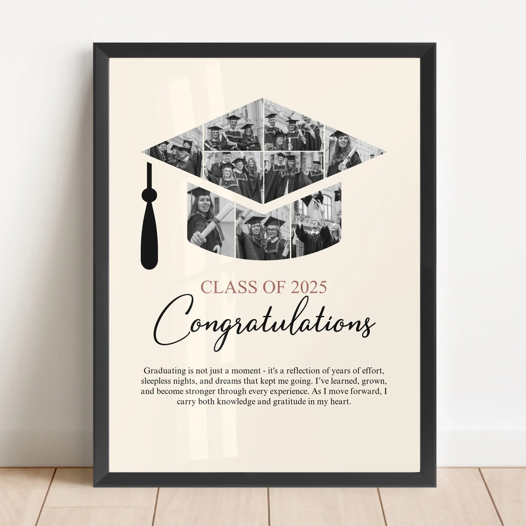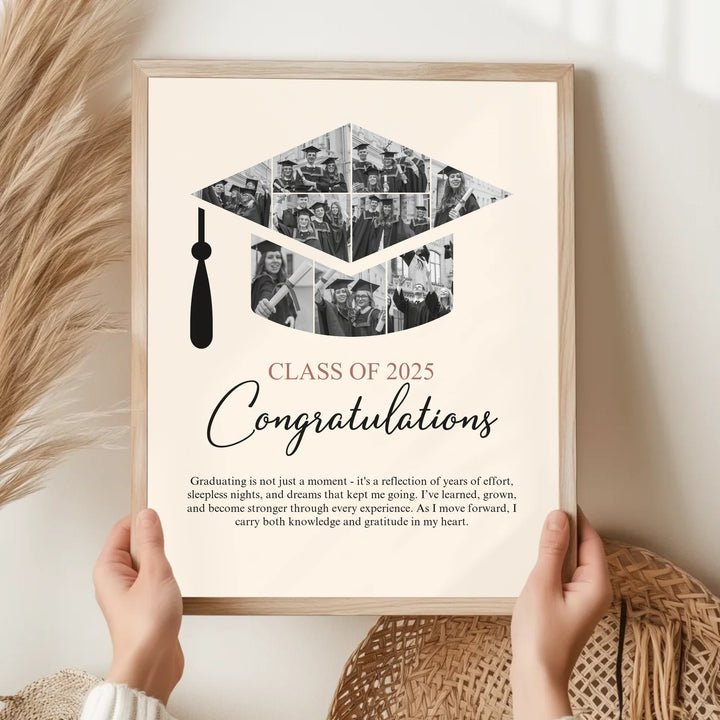 Celebrate your senior’s incredible journey with our Graduation Cap Photo Collage Poster - a custom design shaped like a graduation cap and filled with your favorite photos. From first-day memories to final achievements, this one-of-a-kind print captures it all in a meaningful and creative way.