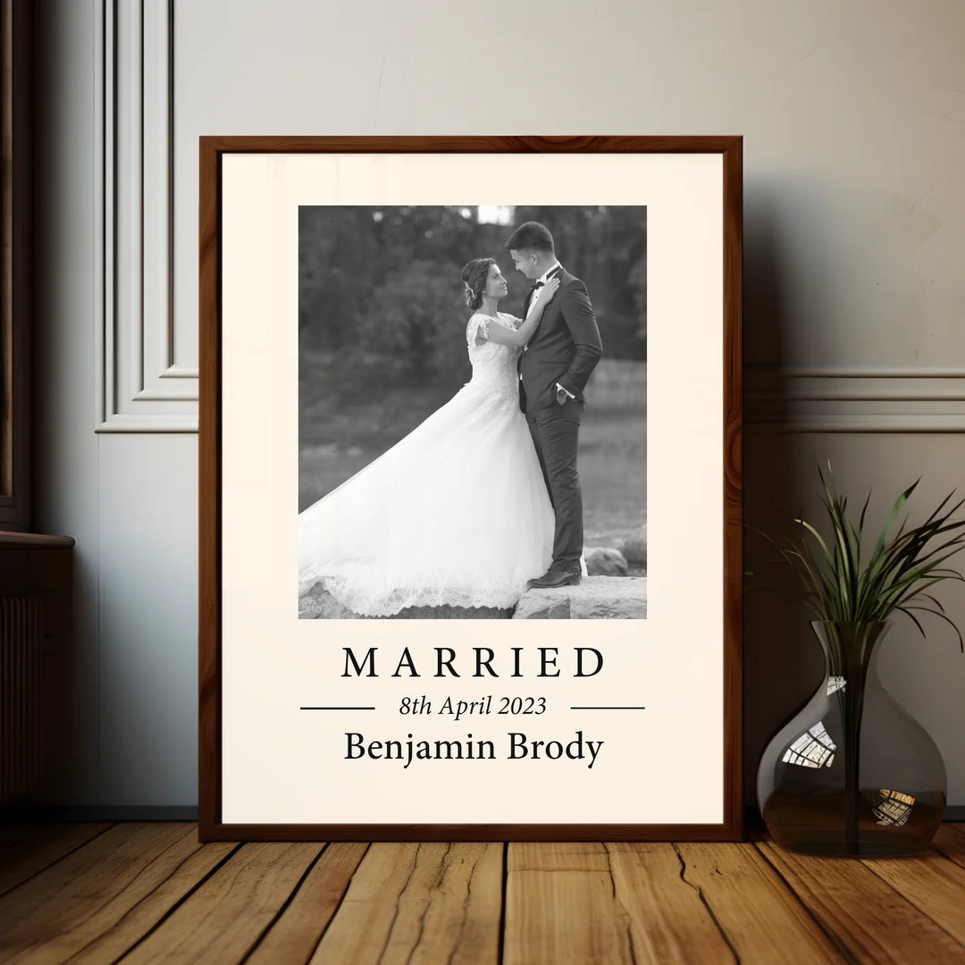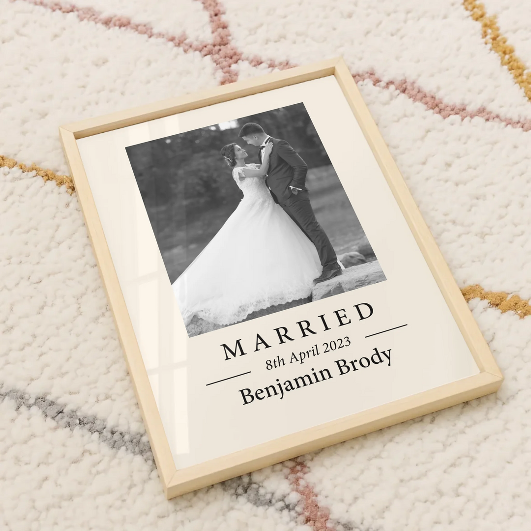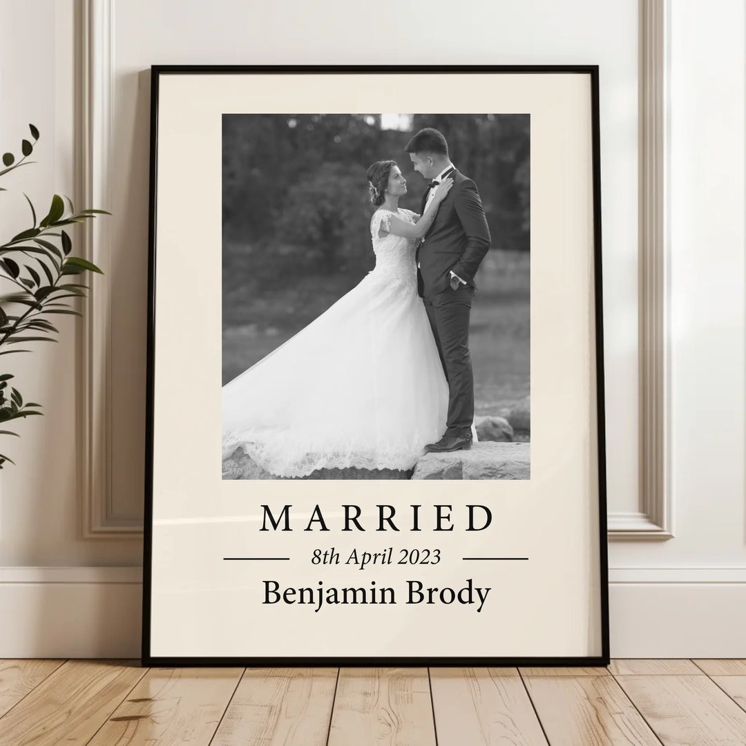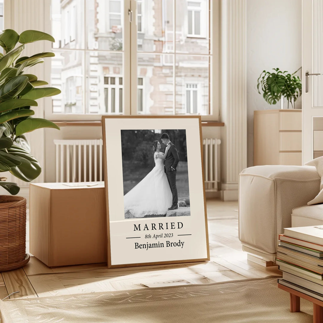 Celebrate your love story with our Custom Wedding Photo Poster — a beautifully framed keepsake featuring your favorite wedding photo, names, and special date. Elegant and timeless, this personalized print is the perfect way to honor your big day and the memories that mean the most.