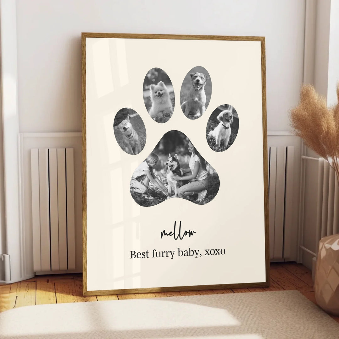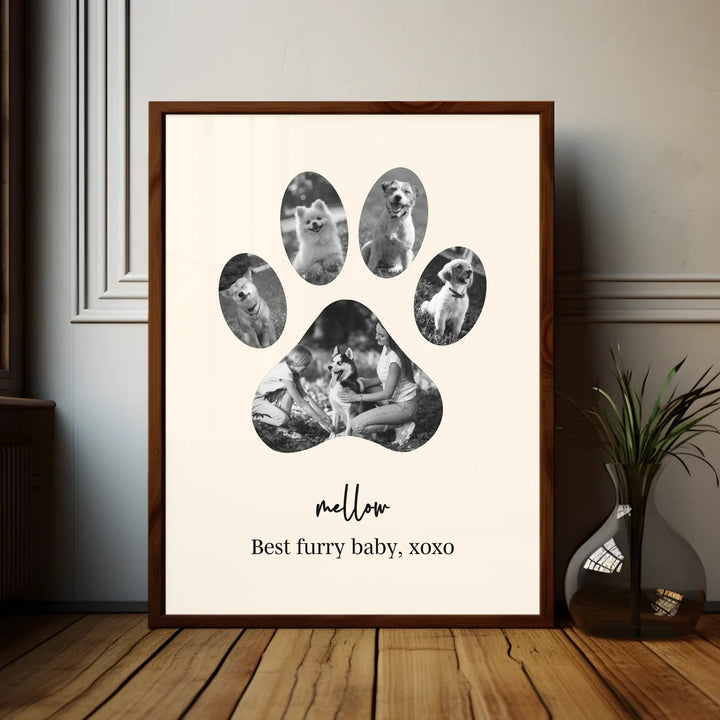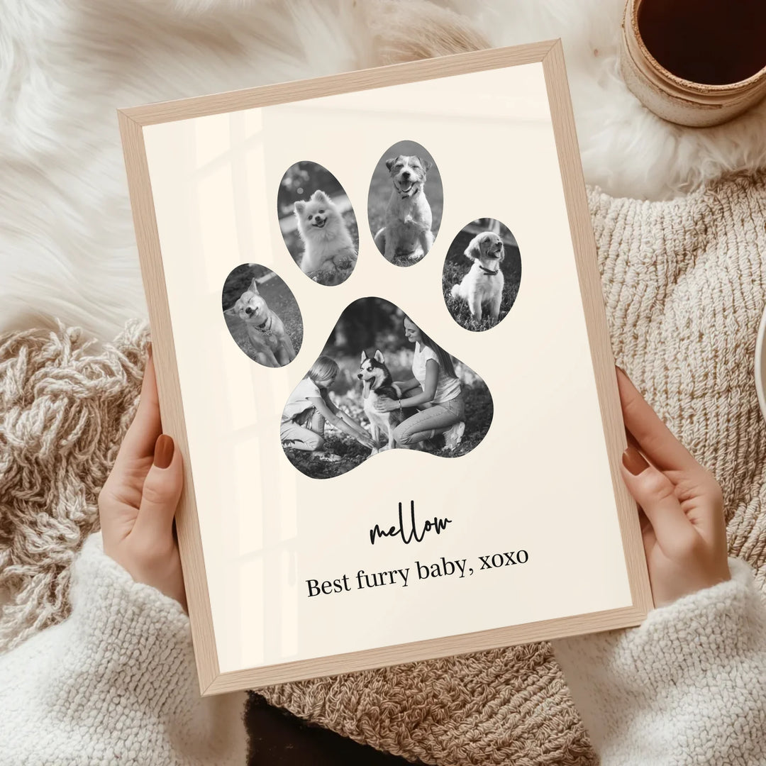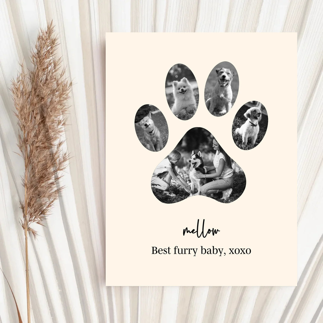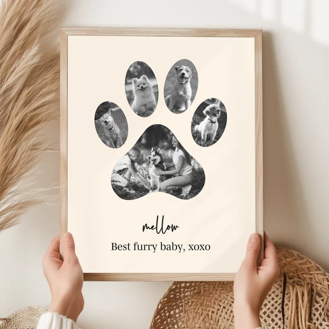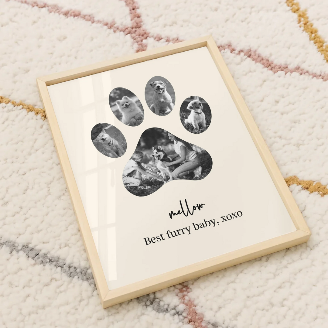 Celebrate the unconditional love of your furry friend with our Dog Paw Photo Collage — a personalized piece designed in the shape of a paw, filled with your favorite memories together. Whether it's to honor a beloved pet or to gift a proud dog parent, this custom print is the perfect tribute to the bond you share.