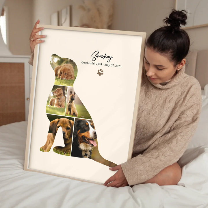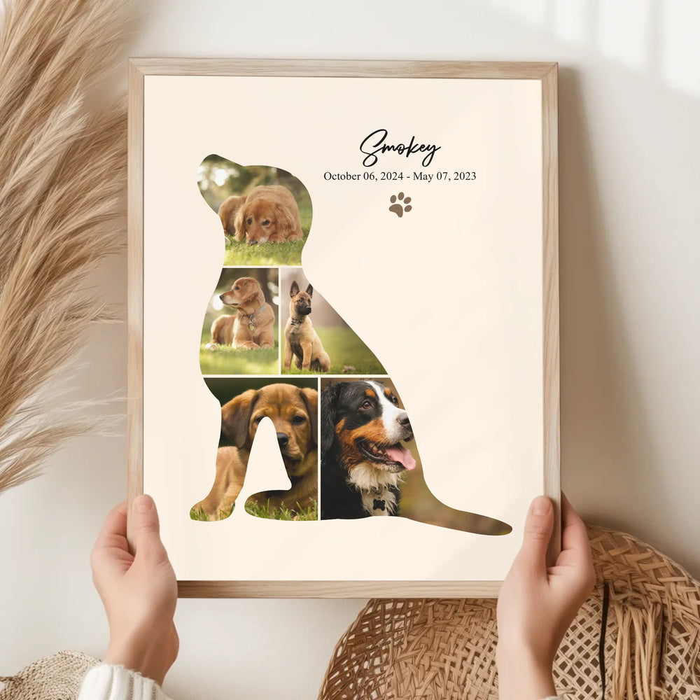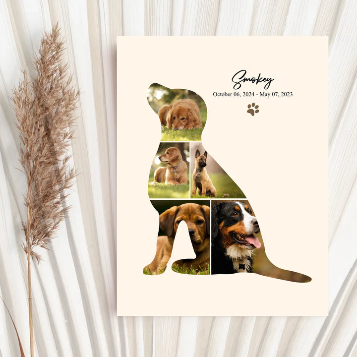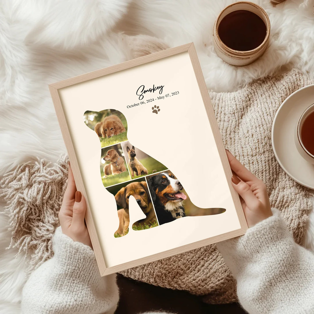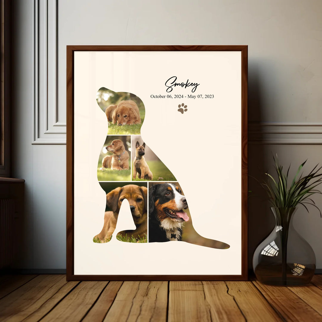 Honor the love and loyalty of your furry companion with our Dog Shape Photo Collage — a personalized memorial print crafted in the silhouette of a dog, filled with your favorite photos. This heartfelt piece is a beautiful way to remember the joy they brought into your life and keep their memory close, always.