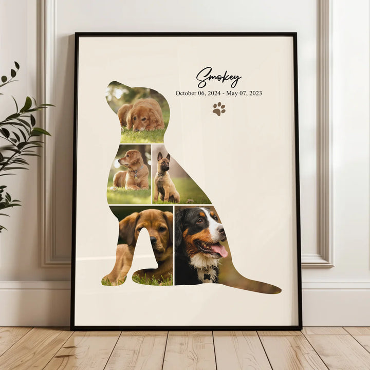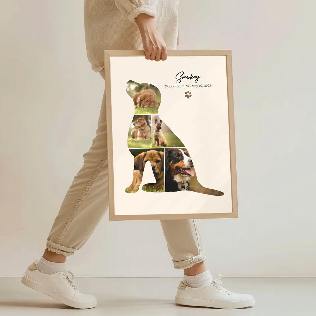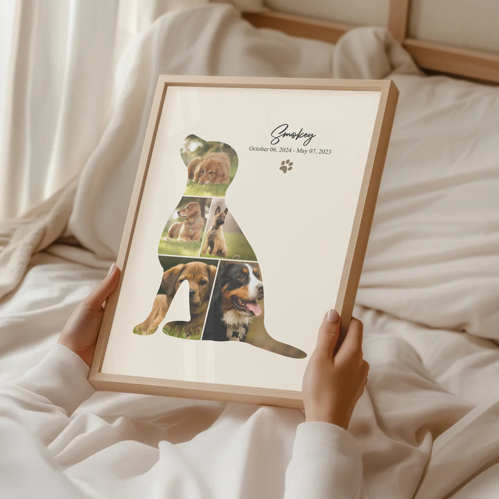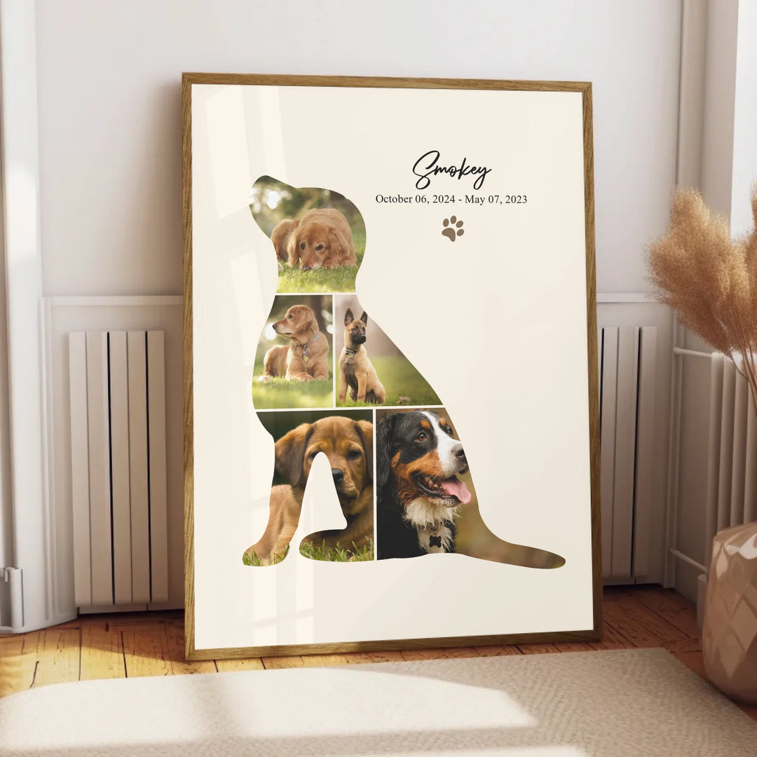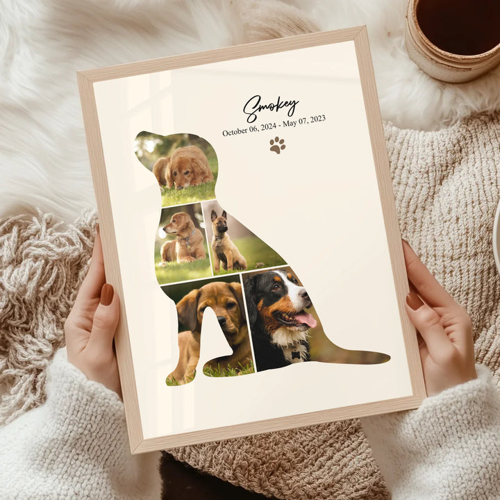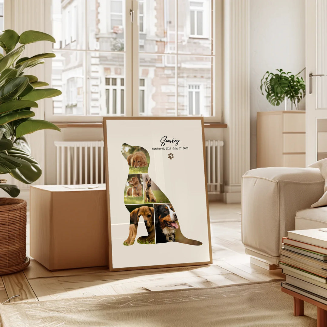 Honor the love and loyalty of your furry companion with our Dog Shape Photo Collage — a personalized memorial print crafted in the silhouette of a dog, filled with your favorite photos. This heartfelt piece is a beautiful way to remember the joy they brought into your life and keep their memory close, always.