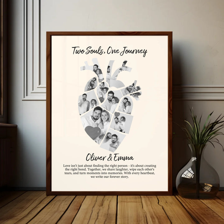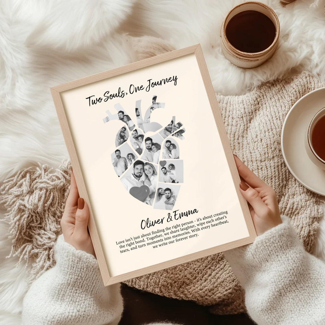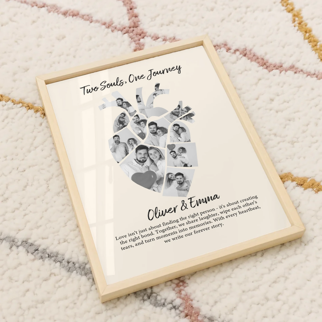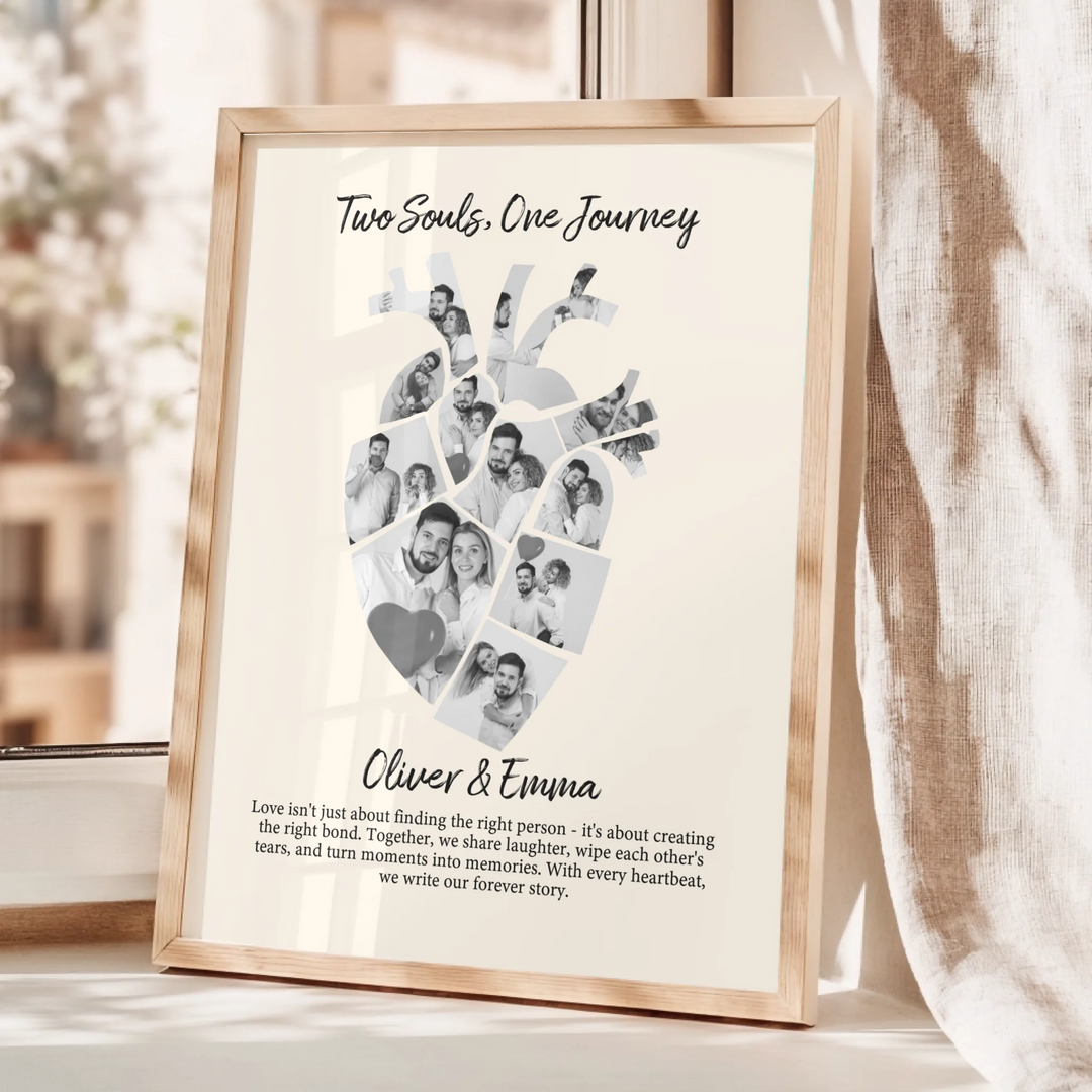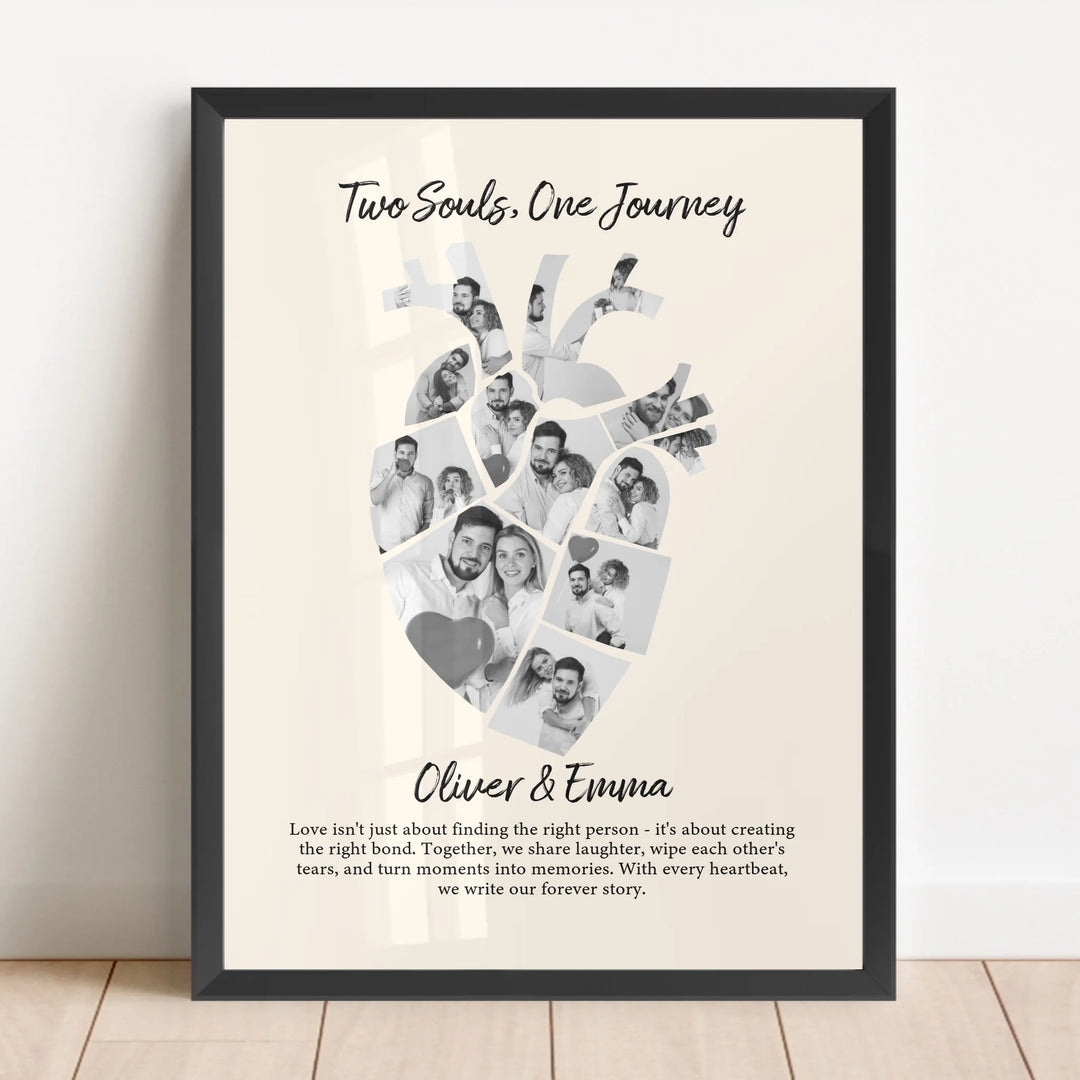 Celebrate your love story with our Personalized Couple Collage Poster - a custom print that arranges your favorite photos into a heart-shaped design, along with your names and a special message. Perfect for anniversaries, weddings, or just because, this keepsake turns your memories into art.