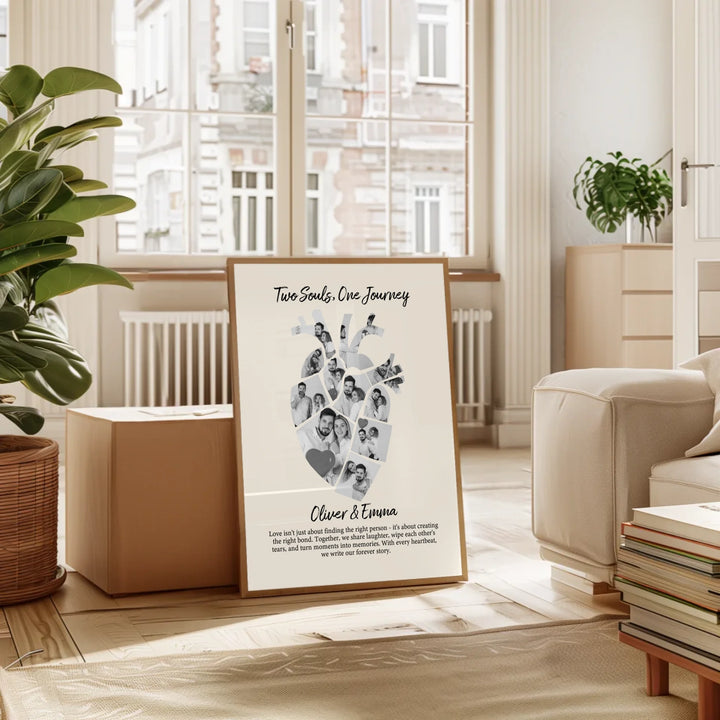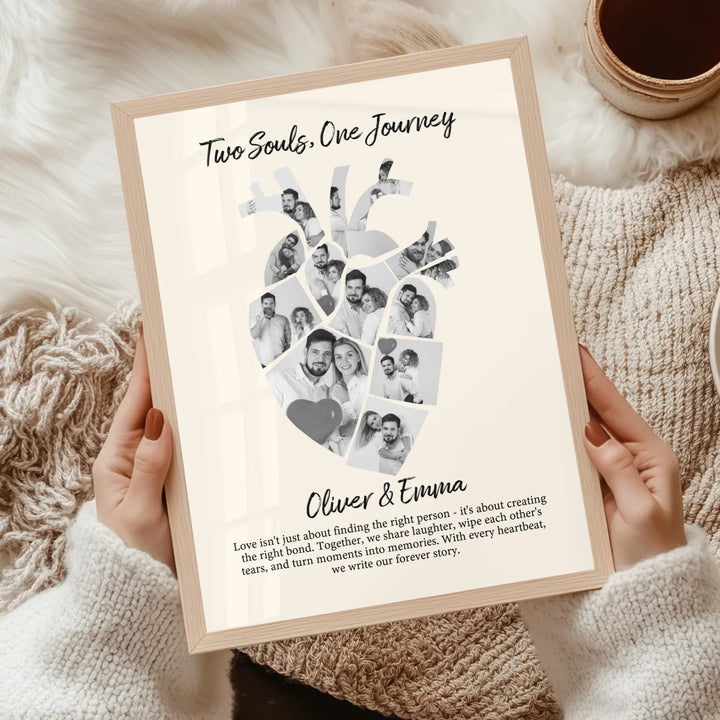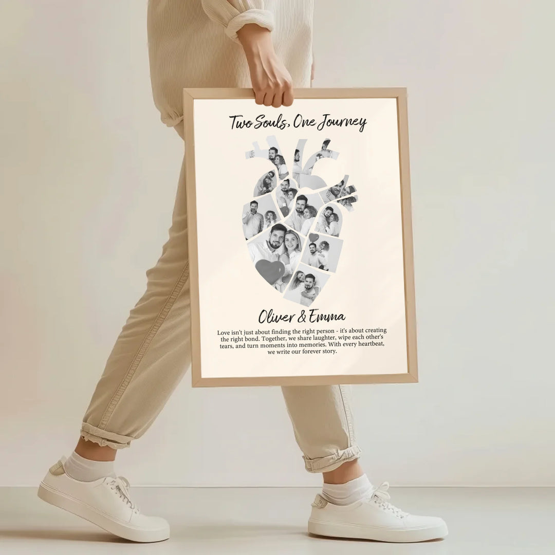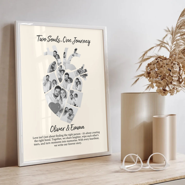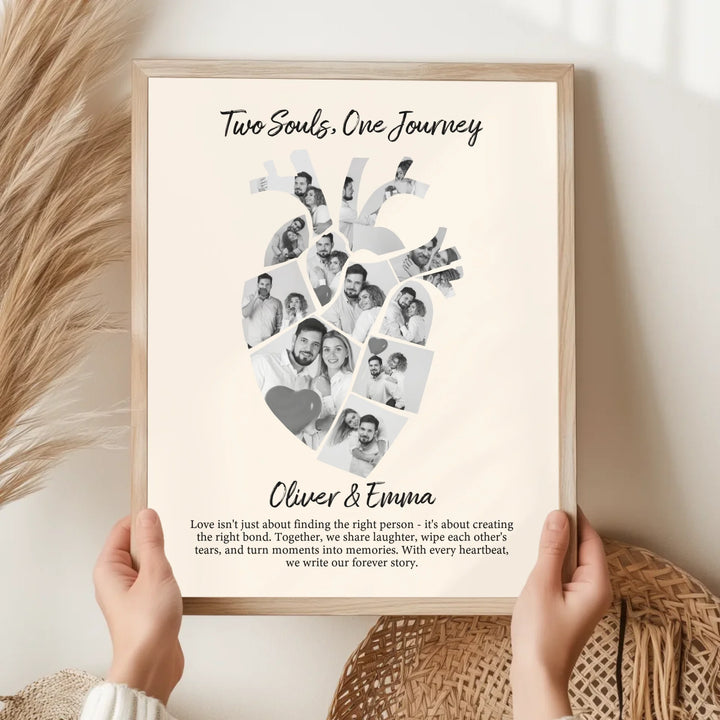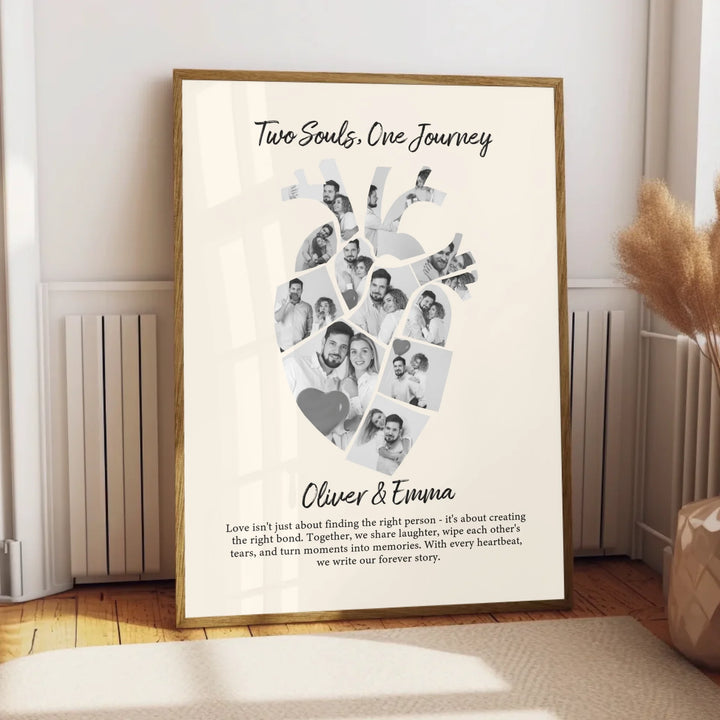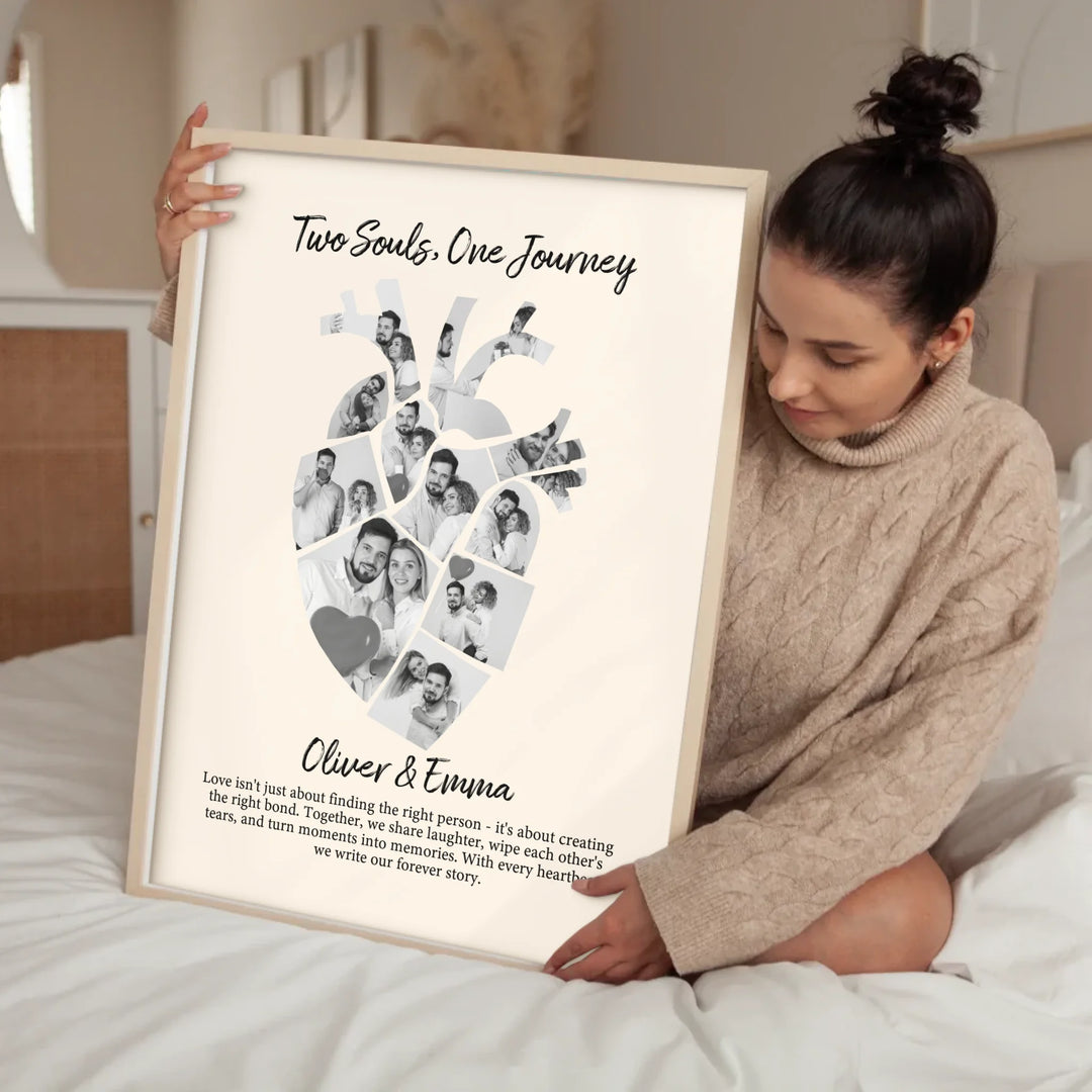 Celebrate your love story with our Personalized Couple Collage Poster - a custom print that arranges your favorite photos into a heart-shaped design, along with your names and a special message. Perfect for anniversaries, weddings, or just because, this keepsake turns your memories into art.