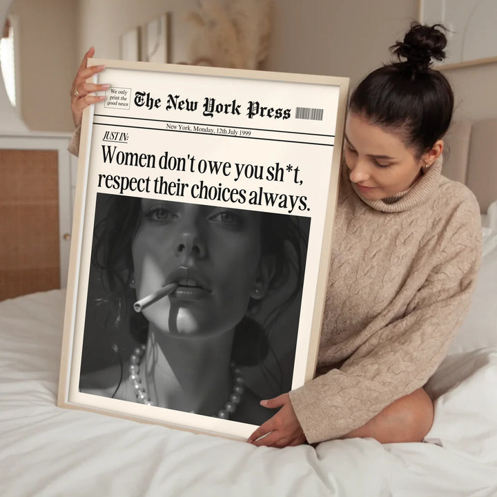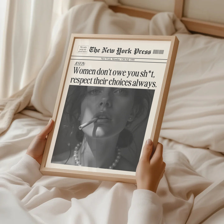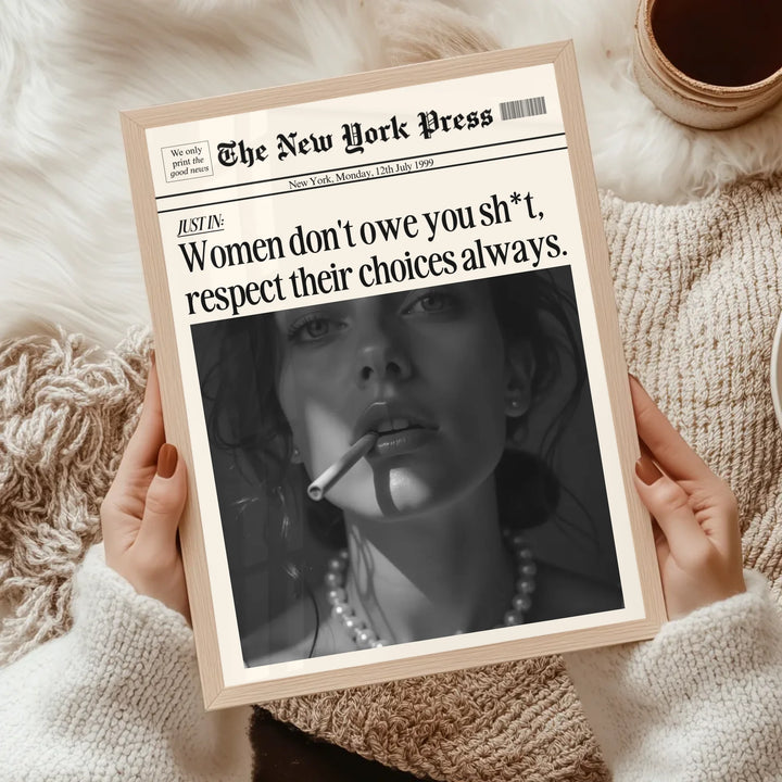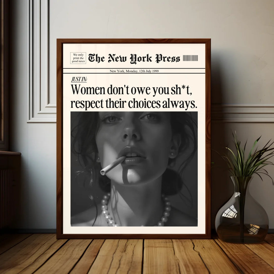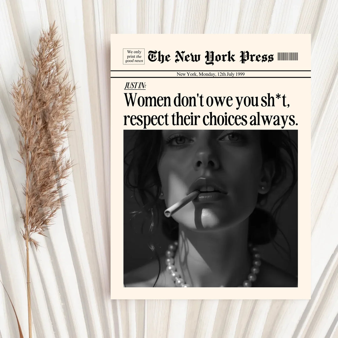 This bold feminist newspaper print is a tribute to unapologetic confidence and unshakable strength. Equal parts retro and rebellious — it’s the perfect blend of art and attitude.